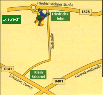 Von der B 401 in den Scharreler Damm in Richtung Klein Scharrel abbiegen. In Klein Scharrel fahrt ihr rechts in die Dorfstraße. In Friedrichsfehn angekommen biegt ihr links auf die Friedrichsfehner Straße in Richtung Edewecht ab und fahrt direkt auf einen Kreisel zu. Den verlasst ihr in der dritten Ausfahrt und schon seht ihr Friedolin´s Spielparadies auf der linken Seite. |